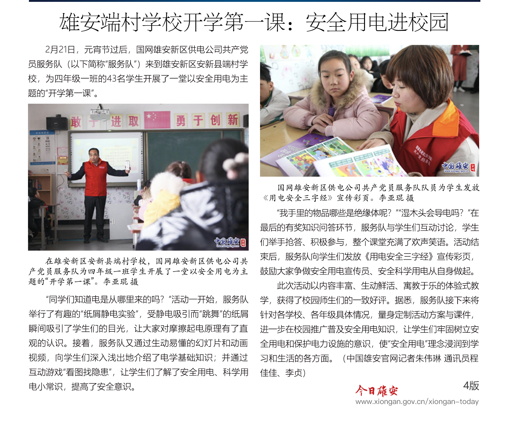 2月21日,元宵节过后,国网雄安新区供电公司共产党员服务队来到雄安新区安新县端村学校,为四年级一班的43名学生开展了一堂以安全用电为主题的“开学第一课”。