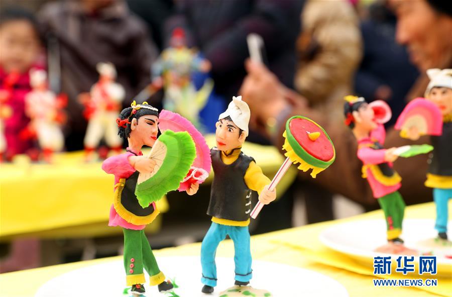2月22日拍摄的题为《井陉拉花》的面塑作品。 当日,河北省石家庄市井陉县秀林镇南张村举办一年一度的面塑展。工艺精湛、色彩缤纷的面塑工艺品吸引了众多游客来前观看。南张村面塑2011年入选河北省非物质文化遗产名录。新华社发(张秀科 摄)
