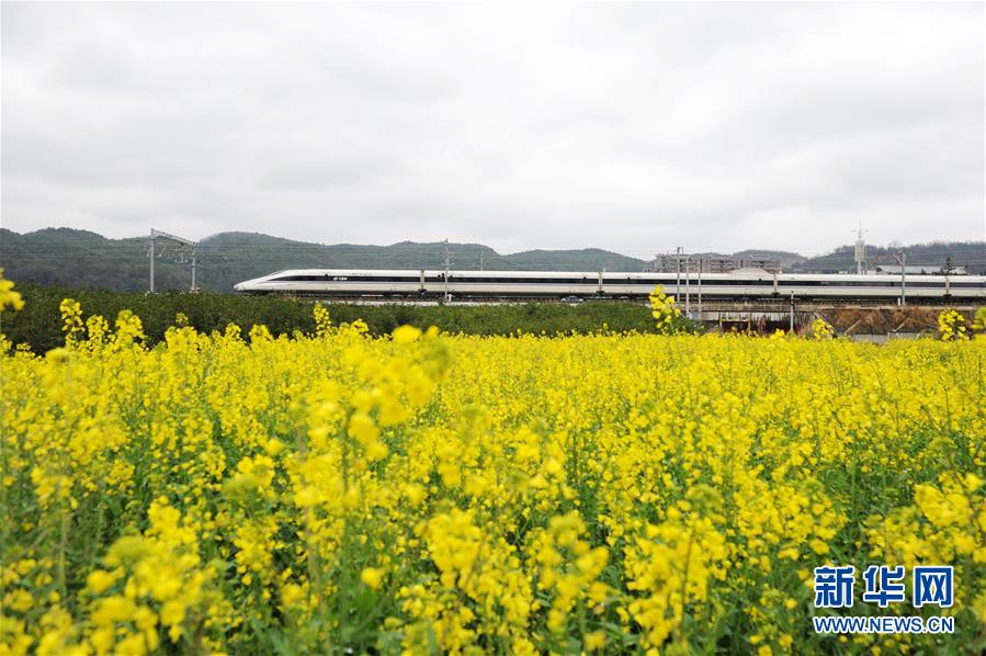 2月23日,一列列车在贵广高铁贵州从江段行驶。早春时节,贵州省黔东南苗族侗族自治州境内的油菜花陆续盛开,列车穿行其间,美不胜收。新华社记者 杨文斌 摄