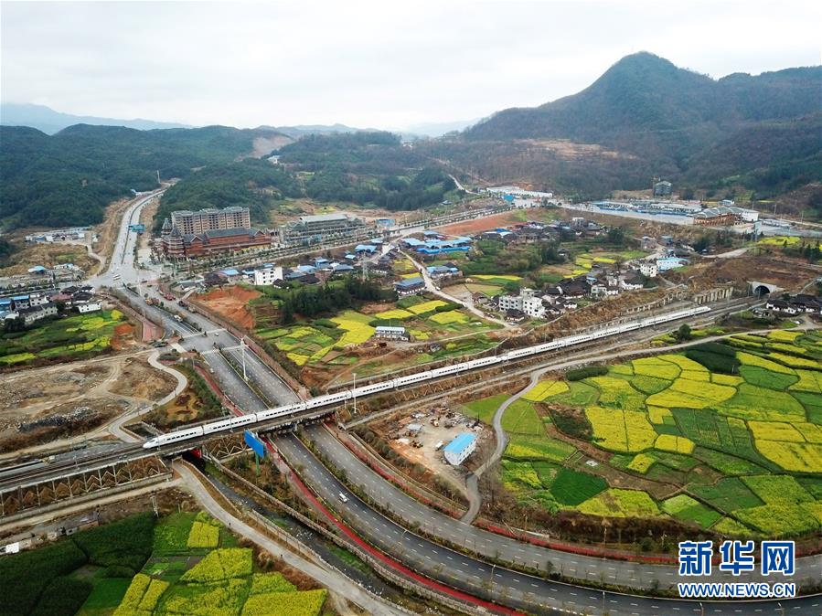 2月23日,一列列车在贵广高铁贵州从江段行驶(无人机拍摄)。早春时节,贵州省黔东南苗族侗族自治州境内的油菜花陆续盛开,列车穿行其间,美不胜收。新华社记者 杨文斌 摄