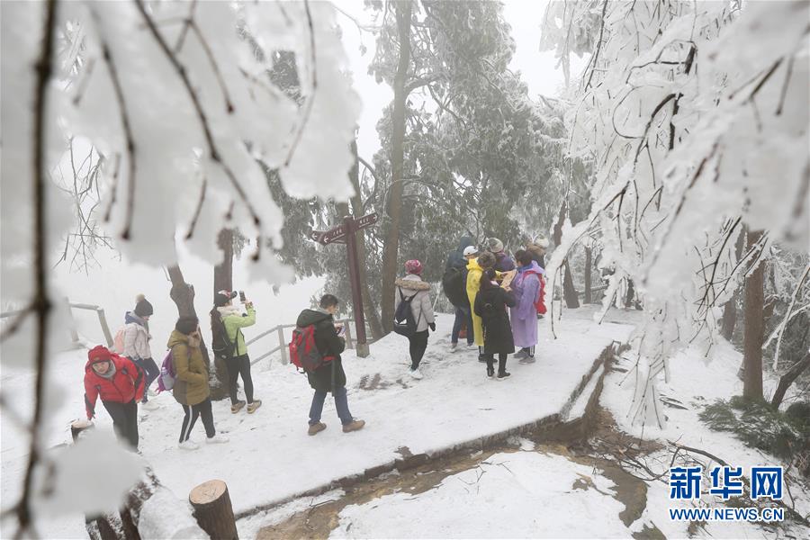 2月23日,游人在湖南张家界黄石寨景区游览。早春时节,湖南张家界武陵源风景区黄石寨、天子山等山区迎来降雪,景区银装素裹。新华社发(吴勇兵 摄)