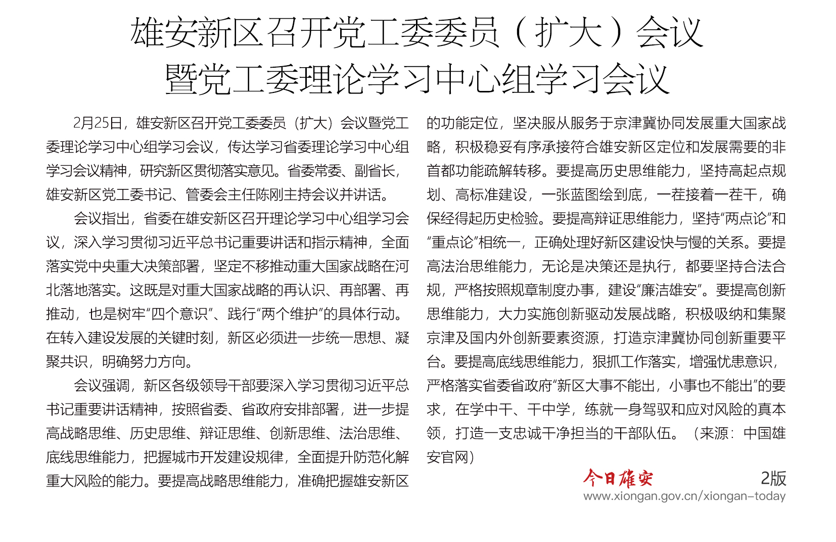 2月25日,雄安新区召开党工委委员(扩大)会议暨党工委理论学习中心组学习会议,传达学习省委理论学习中心组学习会议精神,研究新区贯彻落实意见。