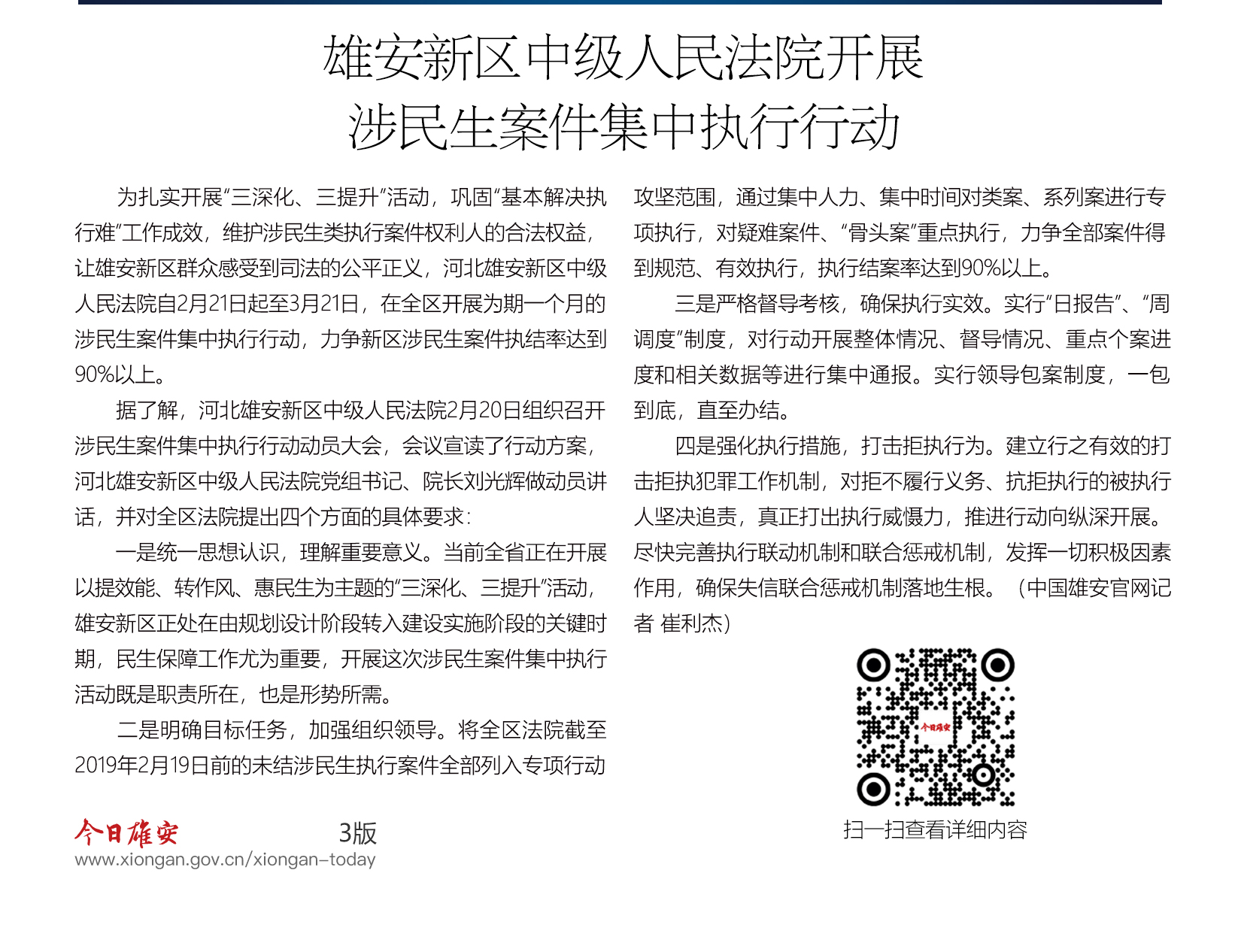 河北雄安新区中级人民法院自2月21日起至3月21日,在全区开展为期一个月的涉民生案件集中执行行动,力争新区涉民生案件执结率达到90%以上。
