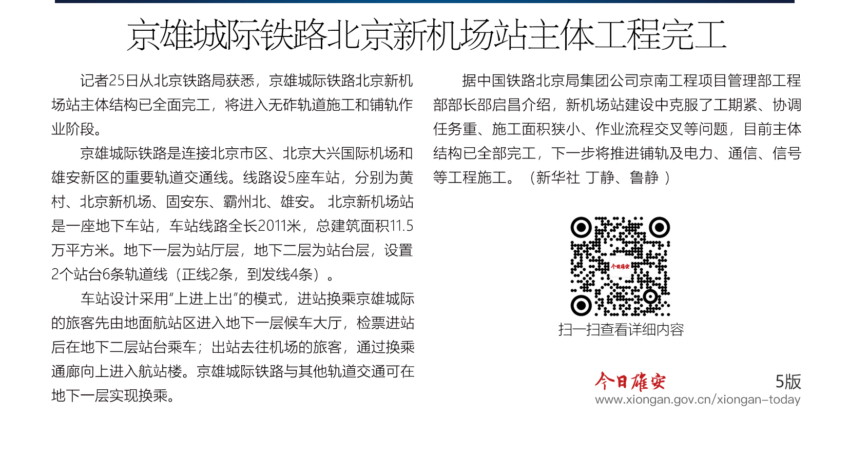 2月25日,京雄城际铁路北京新机场站主体结构全面完工。京雄城际铁路是连接北京市区、北京大兴国际机场和雄安新区的重要轨道交通线。