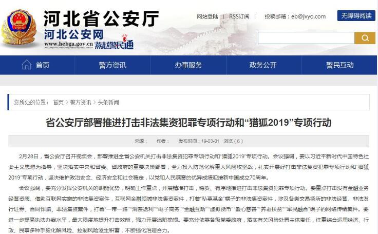 2月28日,河北省公安厅召开视频会议,部署推进全省公安机关打击非法集资犯罪专项行动和“猎狐2019”专项行动。