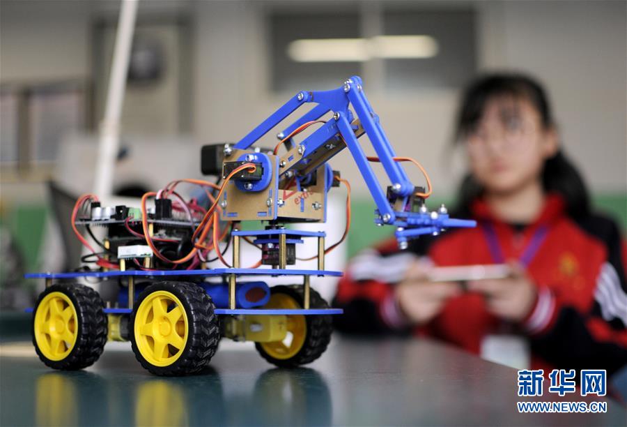3月2日,一名参赛选手在演示自己的机器人。当日,河北邢台市举办青少年机器人竞赛,全市400多名中小学生组成163支代表队,参加了机器人创意比赛、教育机器人工程挑战赛等多个项目的角逐。新华社发(田晓丽 摄)