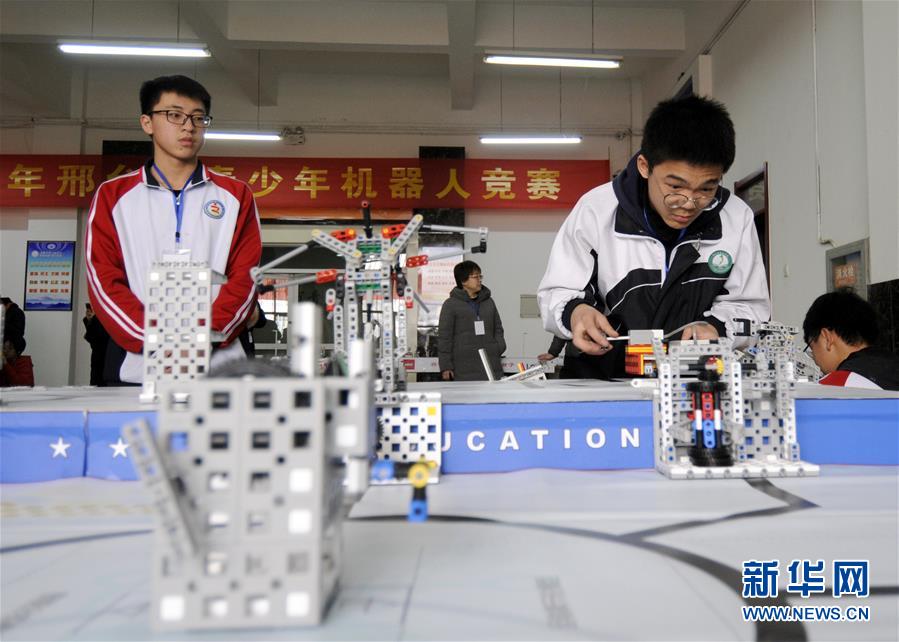 3月2日,参赛选手对机器人进行调试。当日,河北邢台市举办青少年机器人竞赛,全市400多名中小学生组成163支代表队,参加了机器人创意比赛、教育机器人工程挑战赛等多个项目的角逐。新华社发(田晓丽 摄)