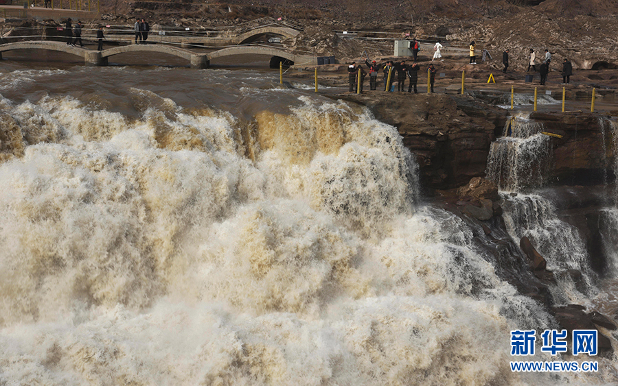 3月3日,游客在黄河壶口瀑布景区游览。近日,随着气温回暖,受上游融冰开河速度加快影响,黄河壶口瀑布水量增大,气势磅礴。新华社发(吕桂明 摄)