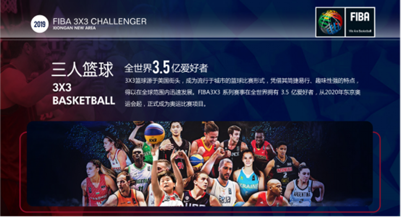 “2019国际三人篮球挑战赛雄安新区站”是由中国篮球协会指导,国际篮球联合会(FIBA)、河北省体育局、雄安新区管委会主办;河北省体育局大球运动管理中心、雄安新区公共服务局、容城县人民政府承办;河北省篮球协会协办;河北引航体育文化发展有限公司独家运营的国际性三人篮球赛事。