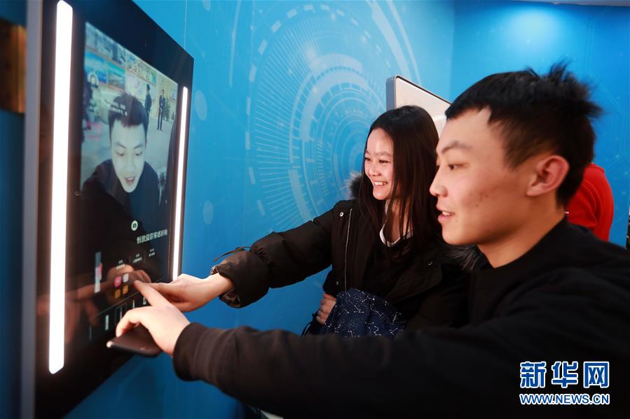 3月5日,参观者在展览上体验“天猫魔镜和试妆镜”。截至3月5日,在北京中国国家博物馆举办的“伟大的变革——庆祝改革开放40周年大型展览”累计现场观众达3982195人次。新华社记者 潘旭 摄