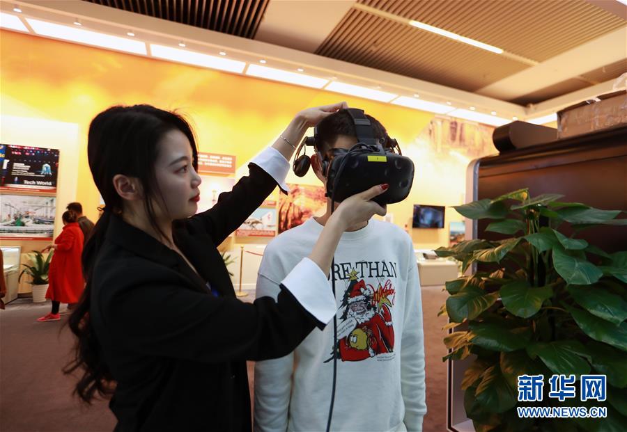 3月5日,工作人员(左)在展览上为参观者佩戴VR眼镜。截至3月5日,在北京中国国家博物馆举办的“伟大的变革——庆祝改革开放40周年大型展览”累计现场观众达3982195人次。新华社记者 潘旭 摄
