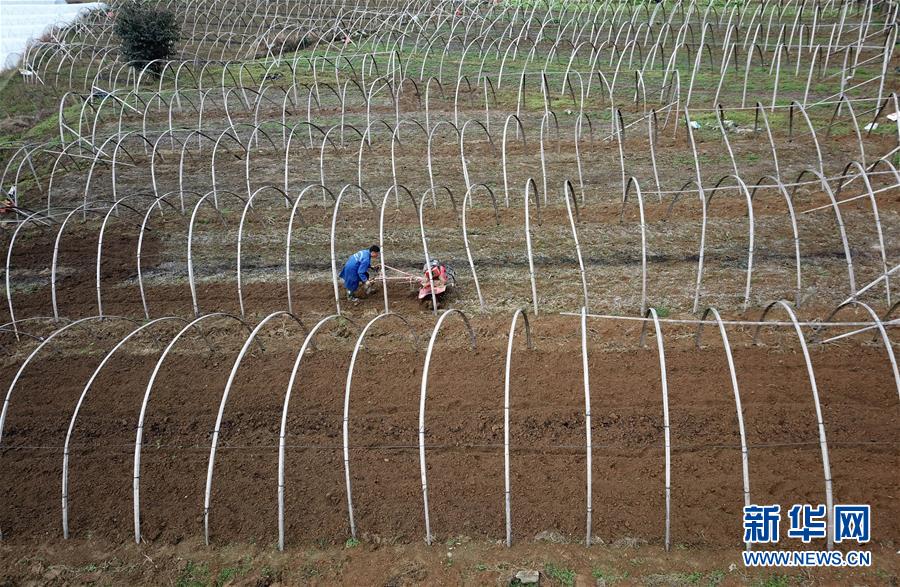 3月6日,贵州省丹寨县兴仁镇甲脚村村民在犁地(无人机拍摄)。当日是二十四节气中的惊蛰,随着气温回升,各地农民忙着春耕春管,田间地头到处是一派忙碌景象。新华社发(黄晓海 摄)