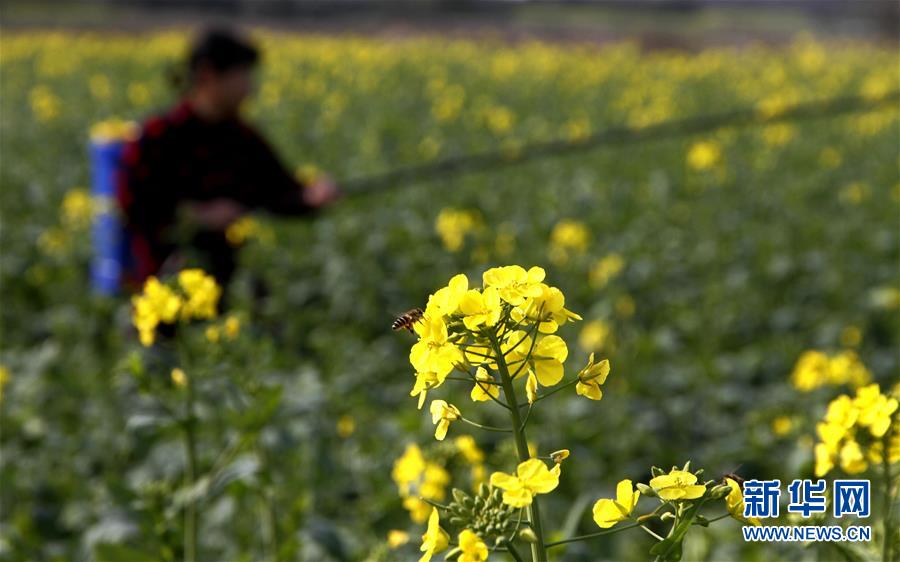 3月6日,江西省靖安县仁首镇石下村农民在油菜花田里喷药。当日是二十四节气中的惊蛰,随着气温回升,各地农民忙着春耕春管,田间地头到处是一派忙碌景象。新华社发(徐仲庭 摄)