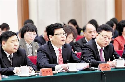 全国人大代表,冀中能源集团有限责任公司董事长、党委书记杨国占(左)结合审议政府工作报告,就如何深化国企改革发言。