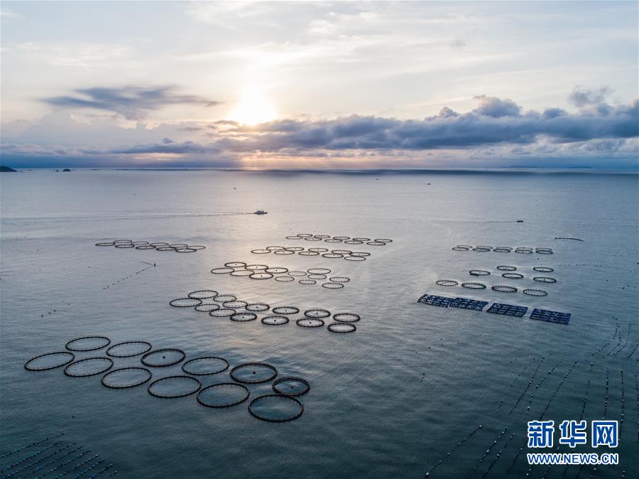 夕阳映照下的浙江省温州市平阳县南麂岛马祖岙海域,圆形的都是大黄鱼养殖网箱(2018年8月18日无人机拍摄)。新华社记者 徐昱 摄