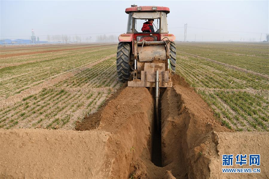 3月10日,挖土机在河北省巨鹿县柳洼村农田内挖沟,以备铺设地下输水管道。目前,河北各地陆续进入春耕备播阶段,河北省巨鹿县涉农部门抢抓时机,兴修农田水利等基础设施,为全年农业丰收打好基础。新华社记者 牟宇 摄