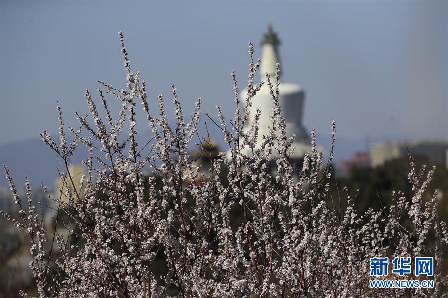 3月11日拍摄的桃花映衬下的北京北海公园白塔。随着天气转暖,北京各大公园和街头的各种春花陆续绽放。新华社发(刘宪国 摄)
