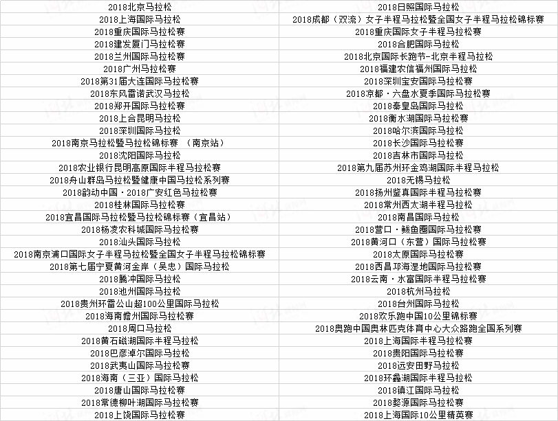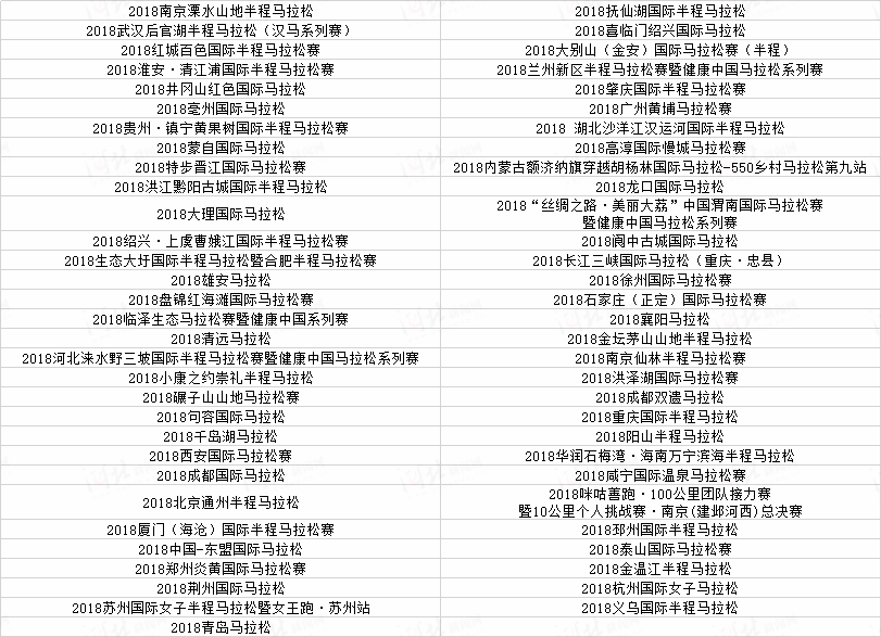 河北省被评为2018中国田径协会金牌赛事的分别是2018唐山国际马拉松赛获、2018秦皇岛国际马拉松、2018衡水湖国际马拉松赛;被评为2018中国田径协会银牌赛事的分别是2018雄安马拉松、2018河北涞水野三坡国际半程马拉松赛暨健康中国马拉松系列赛、2018小康之约崇礼半程马拉松、2018石家庄(正定)国际马拉松赛。此外,河北省2018河间诗经国际马拉松大赛和幽州古道2018超级越野赛被评为2018中国田径协会铜牌赛事。