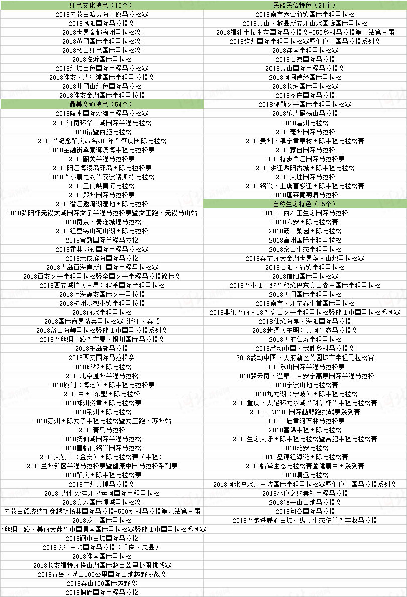 同时,中国田径协会还评选出了包括红色文化特色、民族民俗特色、自然生态特色、最美赛道特色在内的120个特色赛事,其中2018河间诗经国际马拉松大赛被评为民族民俗特色赛事,2018雄安马拉松、2018河北涞水野三坡国际半程马拉松赛暨健康中国马拉松系列赛、2018小康之约崇礼半程马拉松被评为自然生态特色赛事。(见习记者刘洋)