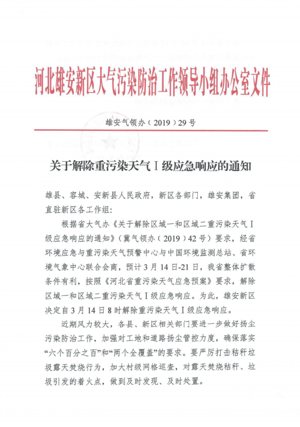 雄安新区决定自3月14日8时解除重污染天气Ⅰ级应急响应。