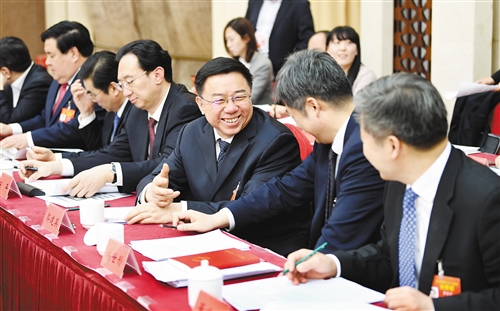 3月12日,人大河北代表团举行全体会议。会上,全国人大代表、河北省保定市市长郭建英(右三)畅谈京津冀协同发展前景。记者李景录 摄