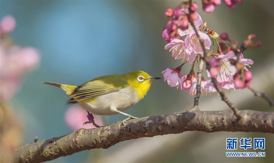 3月14日,一只绣眼鸟在江苏无锡太湖鼋头渚风景区的樱花枝头上小憩。新华社发(潘正光 摄)