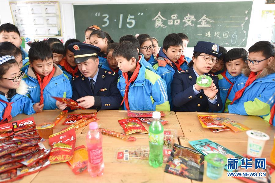 3月14日,江苏省连云港市东海县市场监督管理局执法人员在黄川镇中心小学为学生讲解如何辨别假冒伪劣食品。“3·15”国际消费者权益日来临之际,各地举办形式多样的活动,维护消费者合法权益,提高人们的消费安全意识。新华社发(张正友 摄)