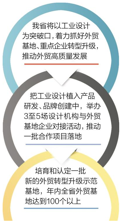 从3月14日召开的全省外贸进出口工作暨外贸企业“双创双服”工作培训会上获悉,今年,我省将以工业设计为突破口,着力抓好外贸基地、重点企业转型升级,推动外贸高质量发展。把工业设计植入产品研发、品牌创建中,举办3至5场设计机构与外贸基地企业对接活动,推动一批合作项目落地,培育和认定一批新的外贸转型升级示范基地,年内全省外贸基地达到100个以上。
