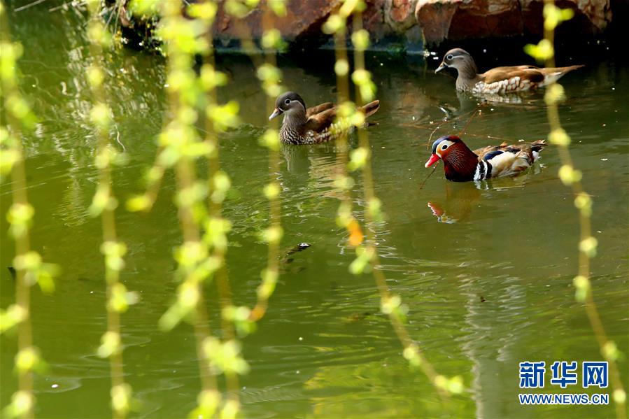 3月15日,鸳鸯在绿柳掩映的苏州可园池塘中结伴游弋。随着气温上升,万物复苏,柳枝吐出新芽,透出春天的气息。新华社发(王建中 摄)