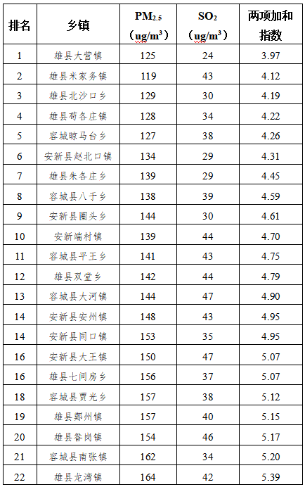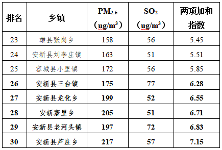 同时,依据乡镇空气站数据,雄安新区大气办对30个乡镇的空气质量进行了排名。排名中,安新县有5个乡镇排在后5名,分别是三台镇、龙化乡、寨里乡、老河头镇、芦庄乡。