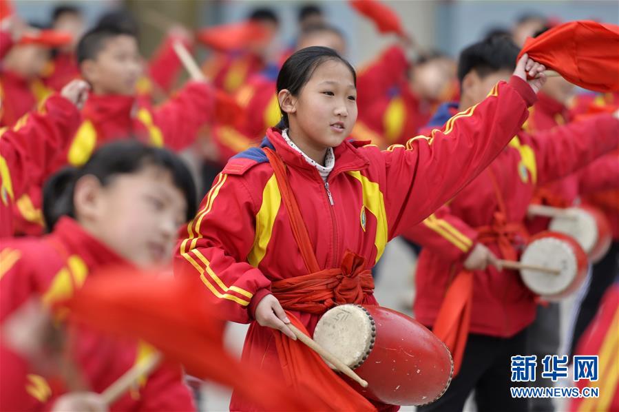 3月20日,百泉小学学生在练习打腰鼓。近年来,河北邢台经济开发区百泉小学积极开展“阳光大课间”系列活动,将传统腰鼓引入校园,开设校本课程,丰富校园文化生活。新华社记者 朱旭东 摄