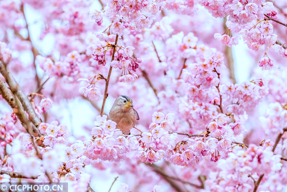 2019年2月23日,重庆市南川区生态大观园,鸟儿在盛开的樱花枝头小憩。CICPHOTO/瞿明斌 摄