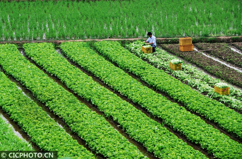 2016年4月13日,广西贺州市八步区农民在菜地里收获春菜。CICPHOTO/廖祖平 摄