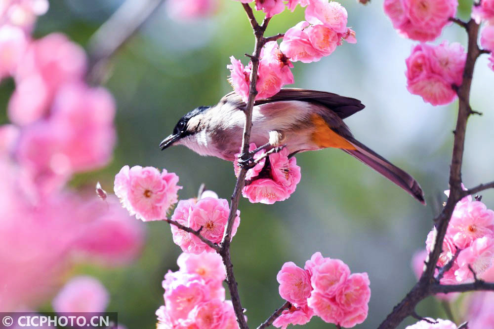 2019年3月3日,贵州省仁怀市街头,一只小鸟在花枝上小憩。CICPHOTO/陈勇 摄