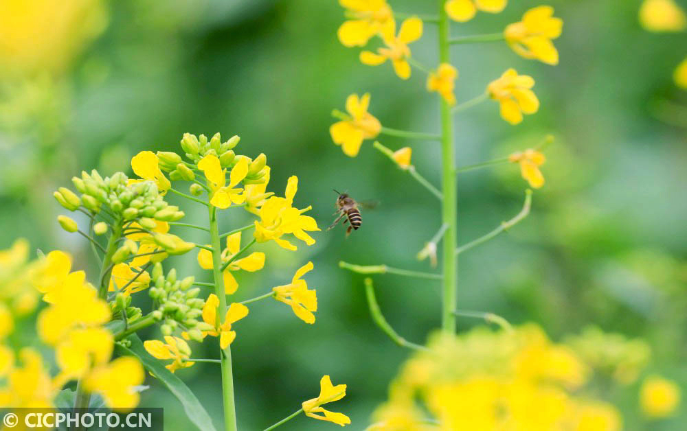 2019年1月22日,蜜蜂在广西柳州市融安县一处油菜花田中采蜜。CICPHOTO/谭凯兴 摄