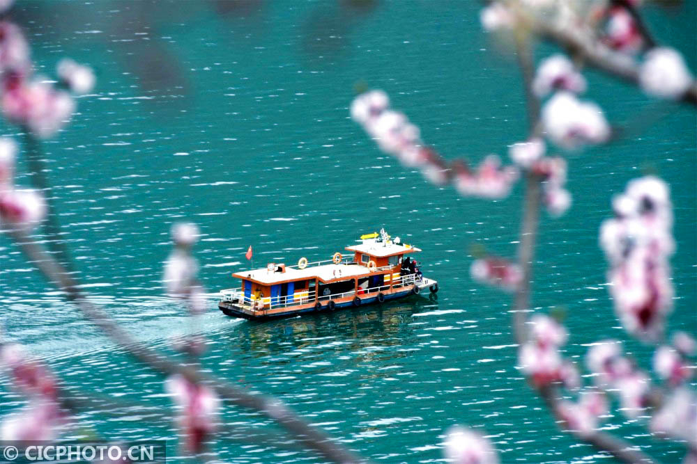 2019年3月2日,船只航行在两岸开满杏花的长江三峡巫峡境内。CICPHOTO/王忠虎 摄