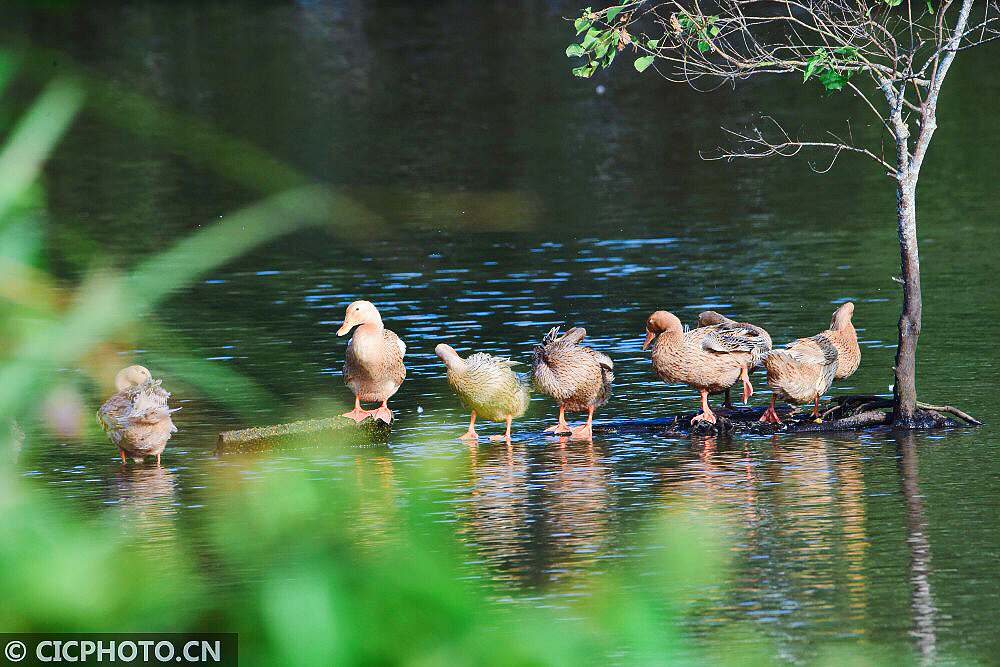 2019年2月19日,海南琼海嘉积镇南崛村,鸭子在池塘里嬉戏觅食。CICPHOTO/蒙钟德 摄