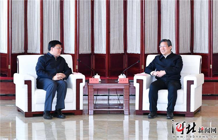 3月22日,省委书记、省人大常委会主任王东峰在雄安新区与到我省检查指导工作的国家卫生健康委副主任王贺胜一行举行工作座谈。记者赵威摄