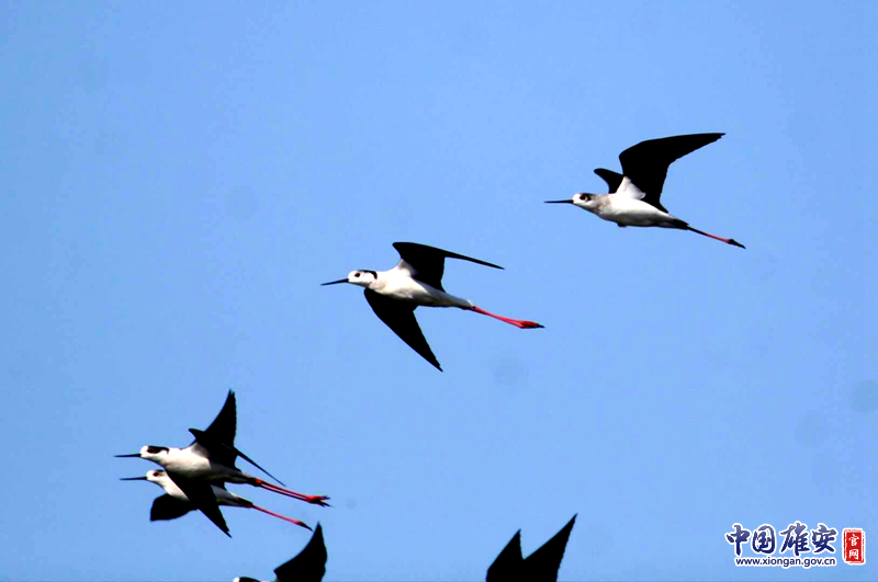 天空中翱翔的黑翅长脚鹬。中国雄安官网发 齐明摄