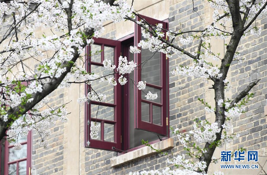 武汉大学的樱花与建筑交相辉映(3月23日摄)。3月23日,众多游客前往武汉大学欣赏樱花。新华社记者 程敏 摄