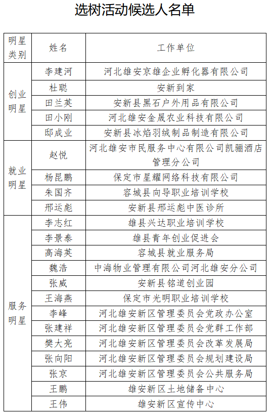 根据《河北雄安新区管理委员会印发<关于开展创业明星、就业明星和服务明星选树活动的实施方案>的通知》(雄安政字〔2018〕40号)要求,结合新区工作实际,经三县政府、新区各部门及雄安集团推荐,并评审,拟推荐李建河等22人为创业明星、就业明星、服务明星候选人(名单附后),现向社会予以公示,公示时间为2019年3月25日-2019年3月31日。公示期间,社会各界如对公示对象存有异议的,可以书面形式向新区公共服务局261房间反映。