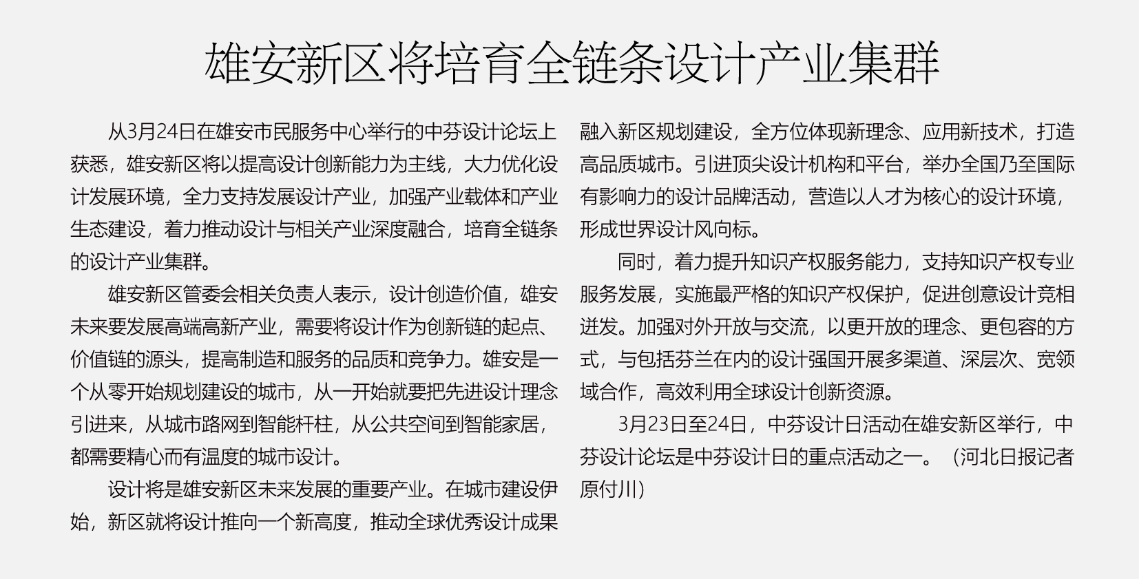 着力推动设计与相关产业深度融合 雄安新区将培育全链条设计产业集群