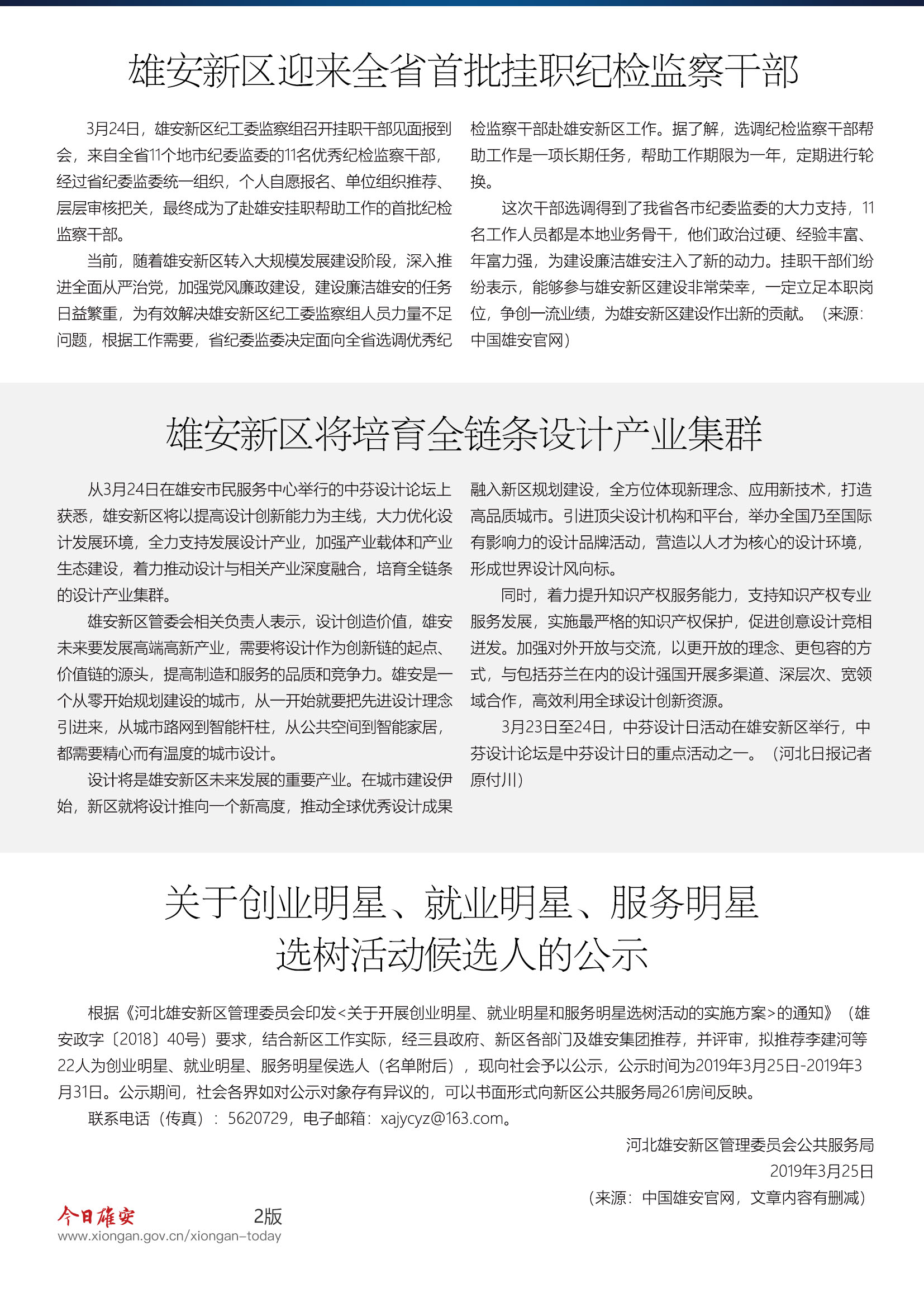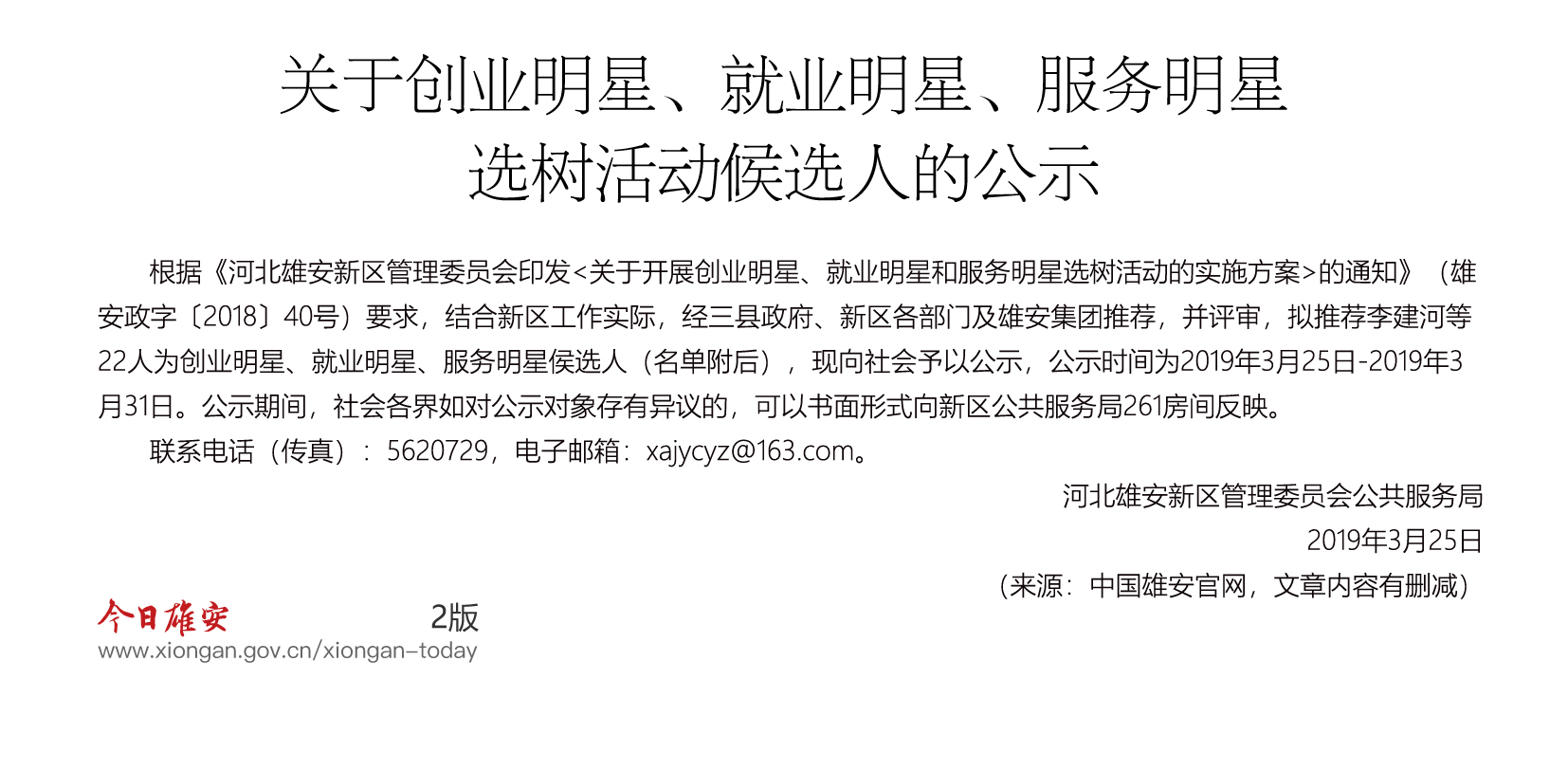 结合新区工作实际,经三县政府、新区各部门及雄安集团推荐,并评审,拟推荐李建河等22人为创业明星、就业明星、服务明星候选人,现向社会予以公示,公示时间为2019年3月25日-2019年3月31日。