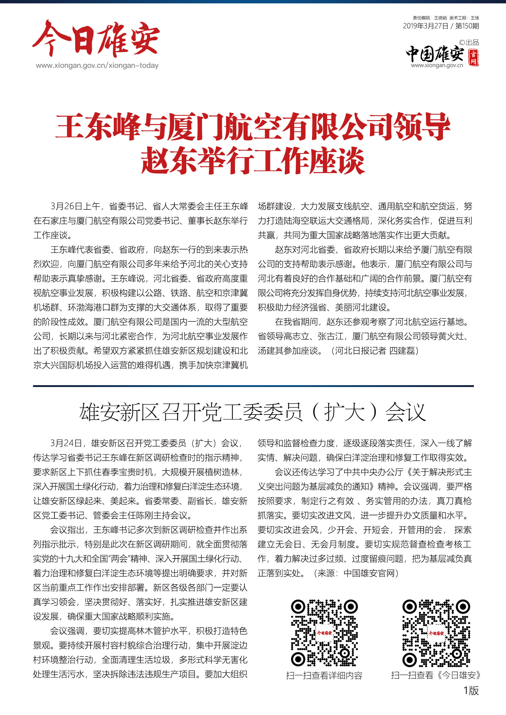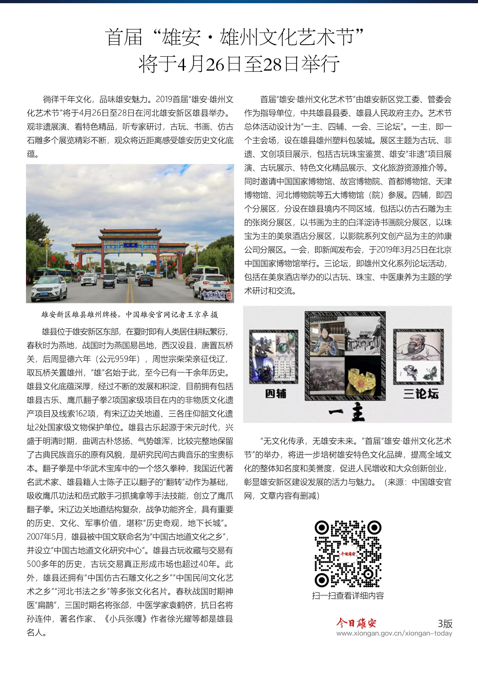 2019年3月25日,首届“雄安·雄州文化艺术节”新闻发布会在中国国家博物馆举行。发布会现场重点推介了文化艺术节活动,并播放了相关宣传片及H5等。