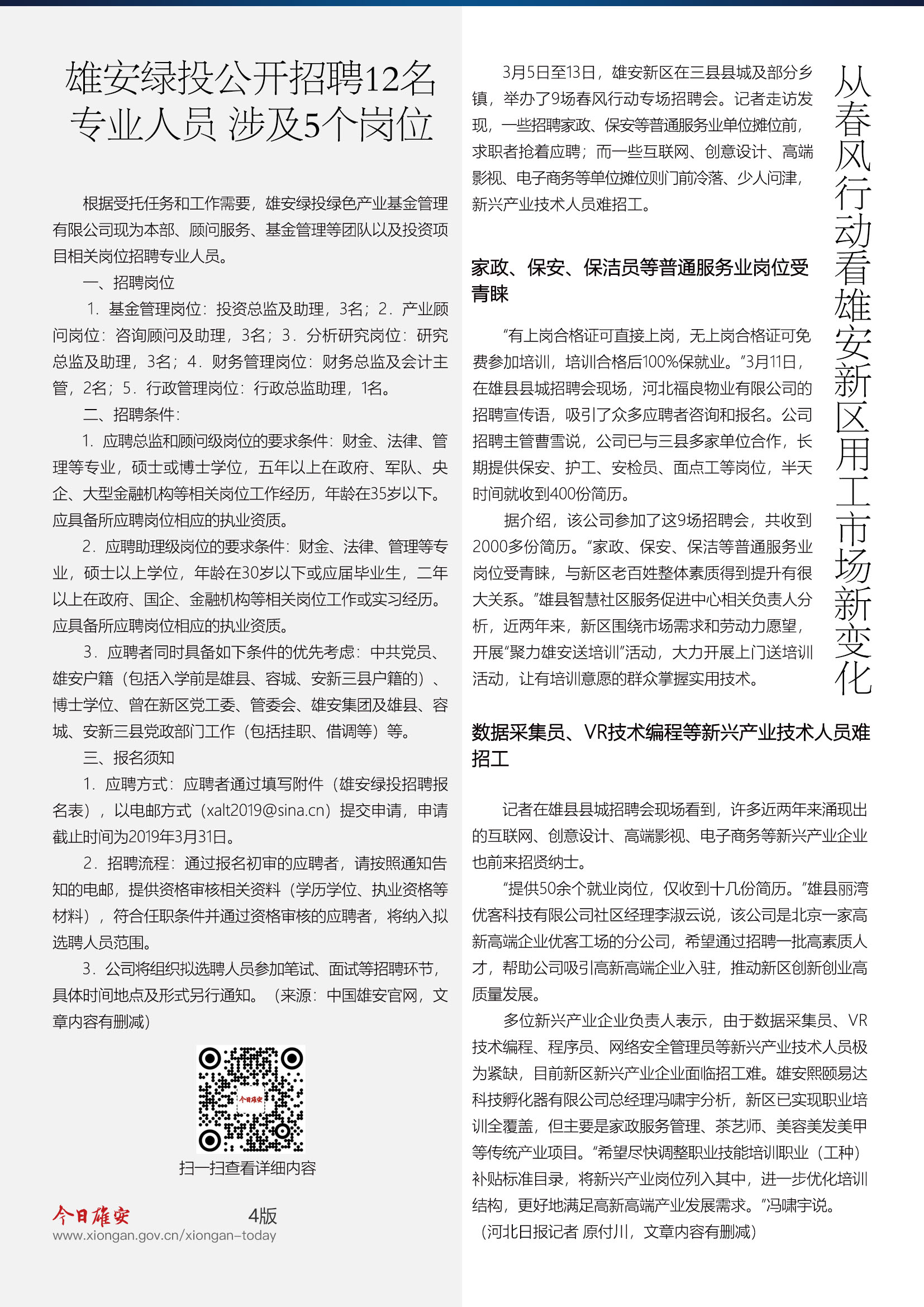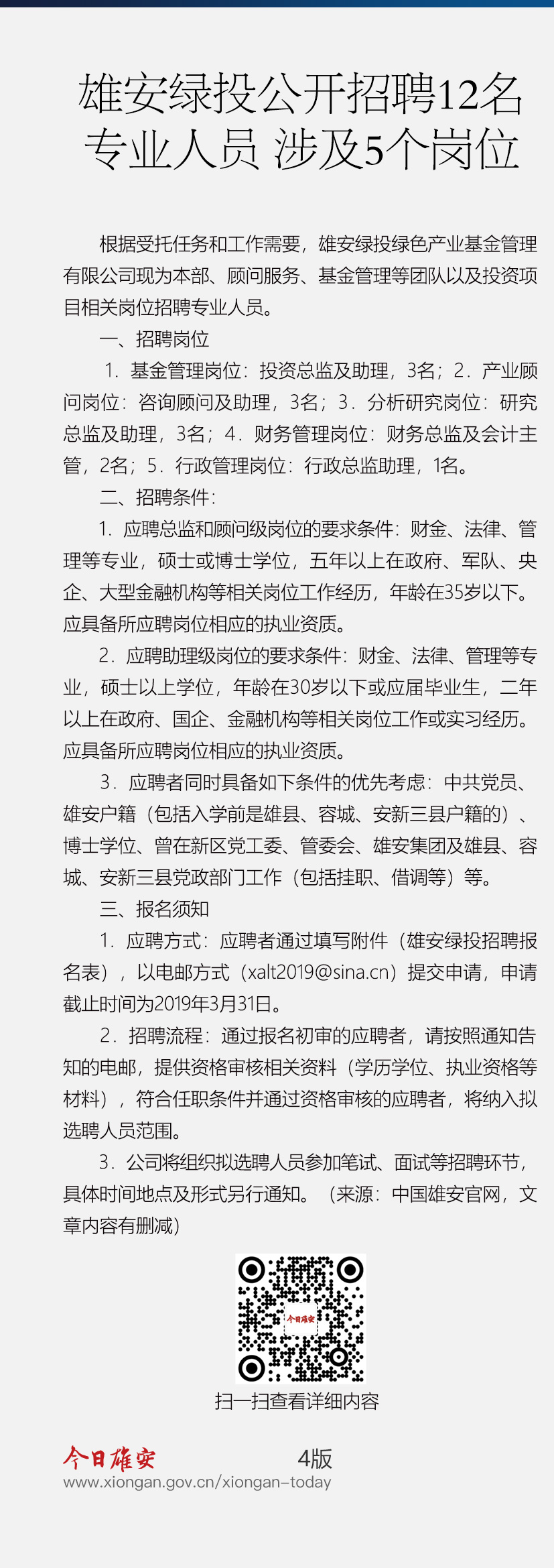 雄安绿投公开招聘12名专业人员 涉及5个岗位