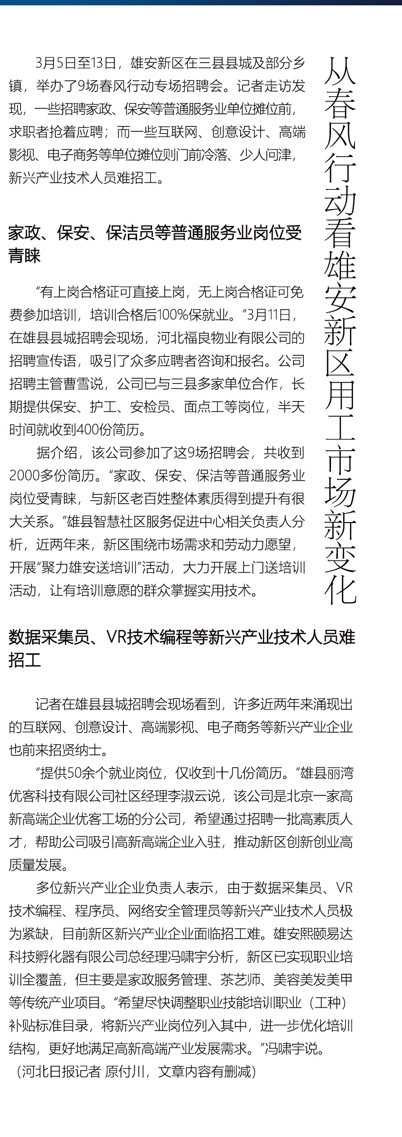 3月5日至13日,雄安新区在三县县城及部分乡镇,举办了9场春风行动专场招聘会。记者走访发现,省内外企业大都提供以本地为主的就业岗位,尽可能满足多数群众就近就业需求。