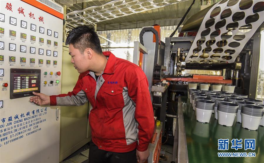 3月27日,在一家从雄安新区外迁到河北省故城县的塑胶包装企业,工人在操作塑胶花盆热压成型机。近年来,河北省故城县围绕承接雄安新区产业外溢,借势协同发展,鼓励落户到故城的企业向高端、智能、绿色转型升级,着力打造绿色环保新材料产业基地。新华社记者李晓果摄