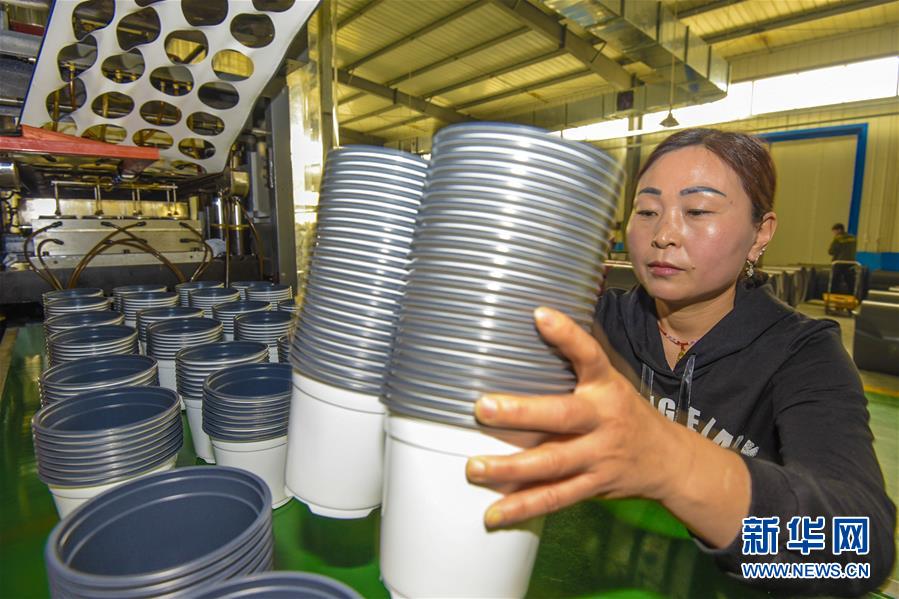 3月27日,在一家从雄安新区外迁到河北省故城县的塑胶包装企业,工人在搬运热压成型的塑胶花盆。近年来,河北省故城县围绕承接雄安新区产业外溢,借势协同发展,鼓励落户到故城的企业向高端、智能、绿色转型升级,着力打造绿色环保新材料产业基地。新华社记者李晓果摄