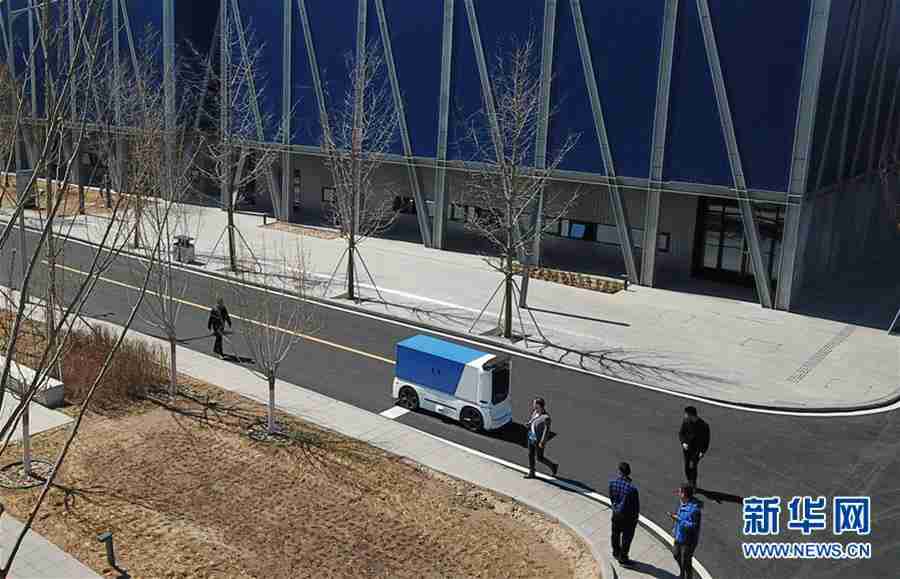 3月31日,快递无人车在雄安市民服务中心内行驶(无人机拍摄)。近日,由菜鸟网络自主研发的新能源快递无人车在河北雄安市民服务中心投入使用。据介绍,该无人车一次最多可以装载200多个小型包裹,完成从驿站到智能柜的快递接驳运输,能感知周边环境,对行人、车辆等各类动态、静态障碍物进行避让。新华社记者 金良快 摄