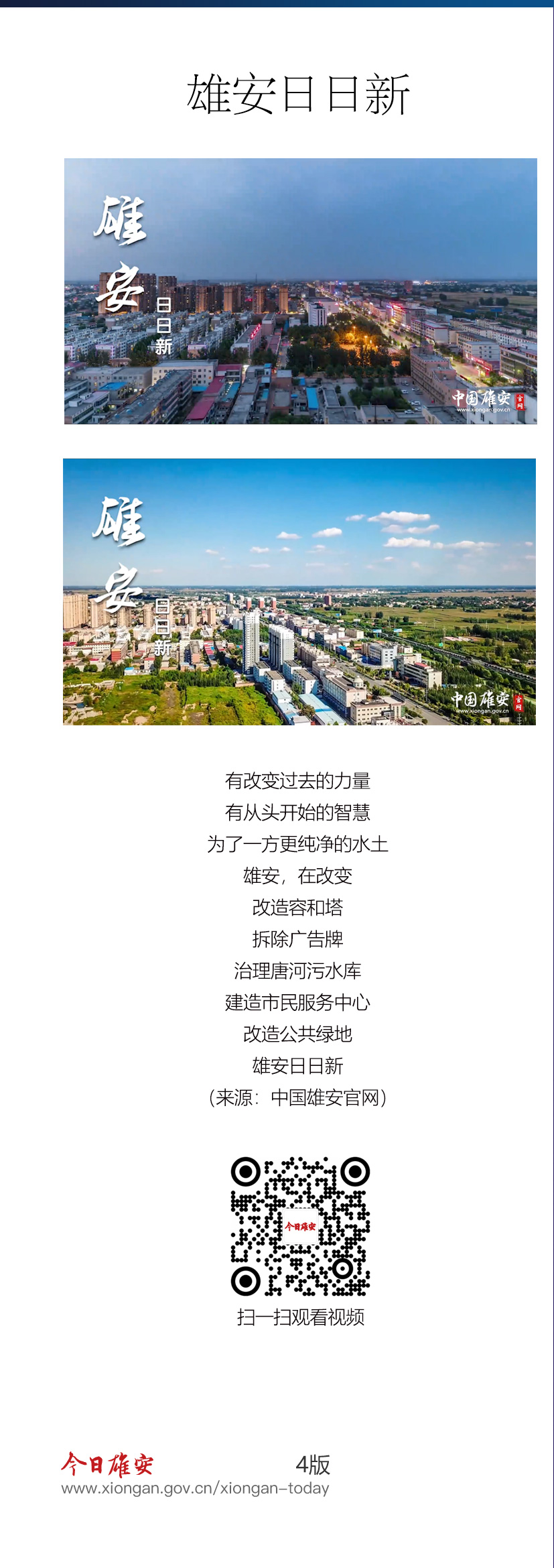 有改变过去的力量,有从头开始的智慧,为了一方更纯净的水土,雄安,在改变。改造容和塔,拆除广告牌,治理唐河污水库,建造市民服务中心,改造公共绿地,雄安日日新。